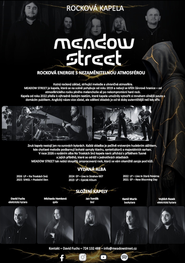 Ke stažení Pokud zde nenajdete, co potřebujete, napište nám na info@meadowstreet.cz. logo pro světlé pozadí PNG_barva PDF_barva logo pro tmavé pozadí PNG_bila PDF_bila foto kapely MEADOWSTREET BIO kapely MEADOW STREET Technický rider & Stage plan MS_technical_rider_stageplan Přední strana alba Na troskách snů Na Troskách Snů přední strana knihy Příběh TUONÉ